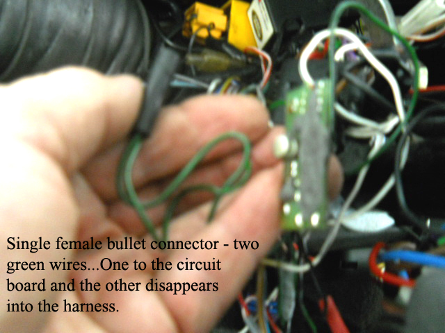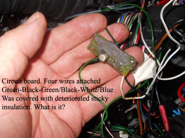 Also, there is an odd electrical thingy swaying in the breeze that looks like a printed circuit board connected hard wired to four light gauge wires emerging from the harness. One wire is white with a black tracer, another is plain black, another is green with a black tracer and the fourth is solid green. The board is about an inch and a half long by about 3/4" wide and has what appears to be either a small round transistor or a diode sticking out of one surface. It apparently was originally wrapped in some sort of sticky fibrous insulation, but for the most part it is bare now.