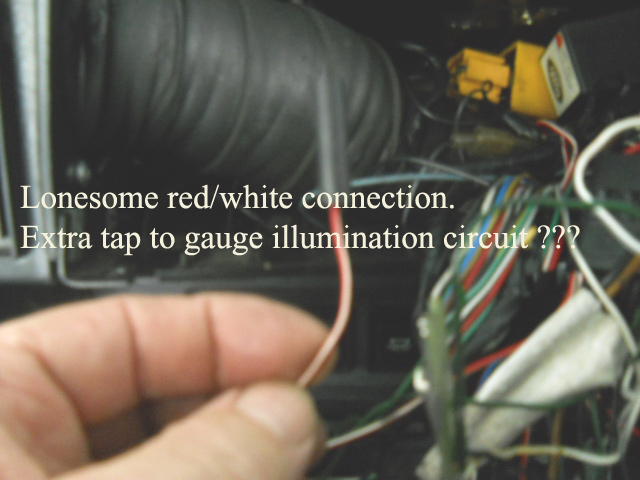 There is a single red/white lead dangling, but I suspect that it might be an "extra" tap into the gauge illumination circuit as I see several such tap provisions on the wiring schematic here and there. The terminal is a female tube/bullet connector.