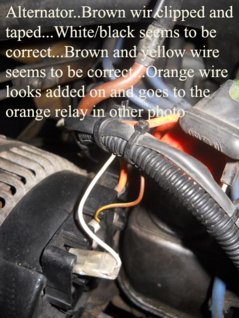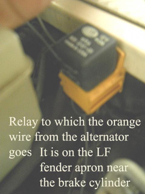 The alternator looks a bit odd to me too. Although it has been on the car for a long time and everyone swears that it's present wiring is what it has always been, things just don't look right. What appears to be the heavy gauge brown wire that would be coming from the battery side of the starter solenoid has been clipped and taped off. In its place is a smaller gauge orange wire that runs over to a relay mounted on the fender apron. The other two wires, the energizer and the ignition warning circuit look to be original.