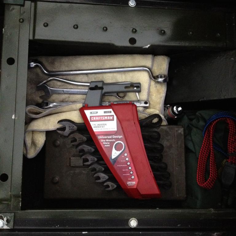 Anyway, I figure I need to put my tools somewhere so most go inside the truck between the passenger seat back and the behind the seat bulkhead. A 109 regular has a lot more space there than an 88. A 30 cal ammo box just fits the space width wise. I have a little shelf the box sits on. I keep a long pry bar and torque wrench under the shelf, most of the tools in the box on the shelf, a carrier with the sockets on top of the box and a carrier with combination wrenches on top of the socket carrier. In the outside corner alongside the ammo box is the big hub socket, some rags and now that I have EFI, a fuel pressure gauge.