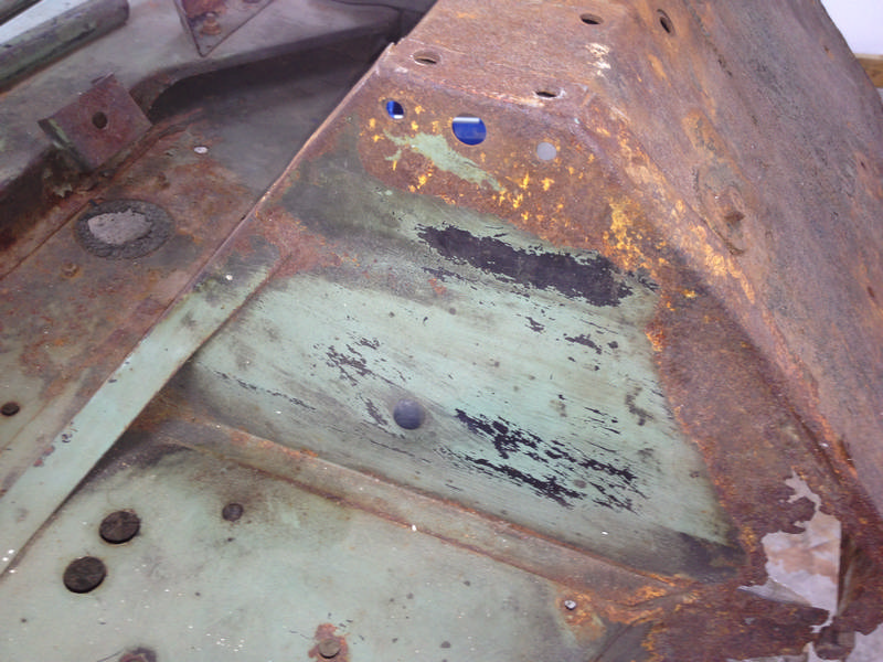 So onto the bulkhead. It was obvious before sandblasting that the bottom half of each door post and the footwells would need replacing. Above the footwell, everything looks rust and dent free.