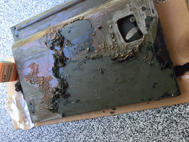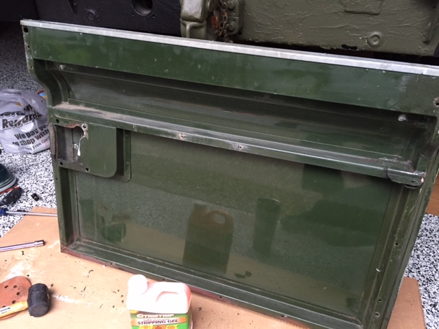 As you can see in the photos, the Citristrip removed the Latex paint like a charm. It ate through it and "popped" it right off the base layer like it was a kid eating candy. With another application it then ate through the layer below that of the MOD Camo job paint. Not sure actually what they had used. I think it was a basic enamel, but hard to tell. The really good thing WAS.... Drum roll please .... It left the original Factory Bronze Green untouched and looking like it rolled out of the factory. See photos below. I will see how the next section goes and what is underneath. I still going to shoot some primer layers over the outside since before I knew it would leave the original paint, I took it down to bare metal in some places and going to dip the door frame in a bath of rust converter and then epoxy primer or some kind of rustoleum bath. I noticed on ECR's website where they document restorations, they seem to dip the steel parts in a bath of red stuff.