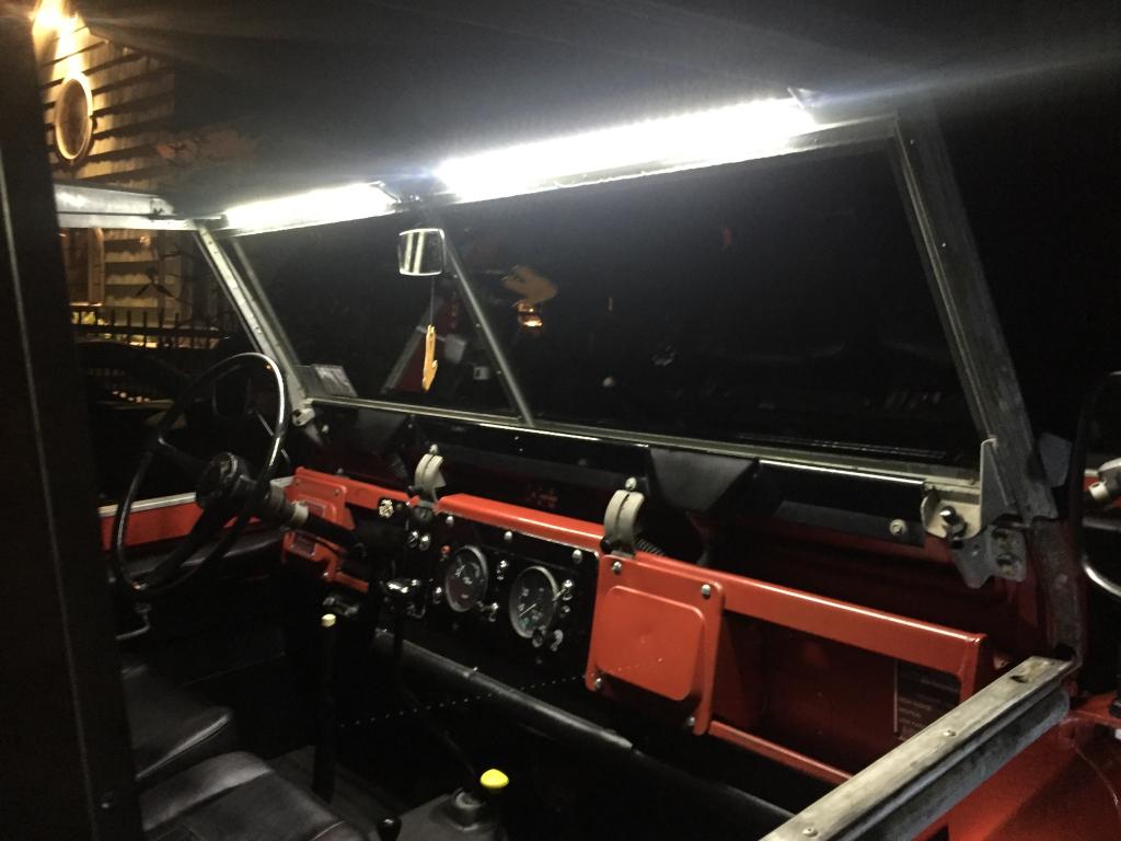 I installed a couple of LED lights just over the top of the windscreen and they are tied into the dome light switch. They are super bright and you can barely even notice the fixtures themselves.