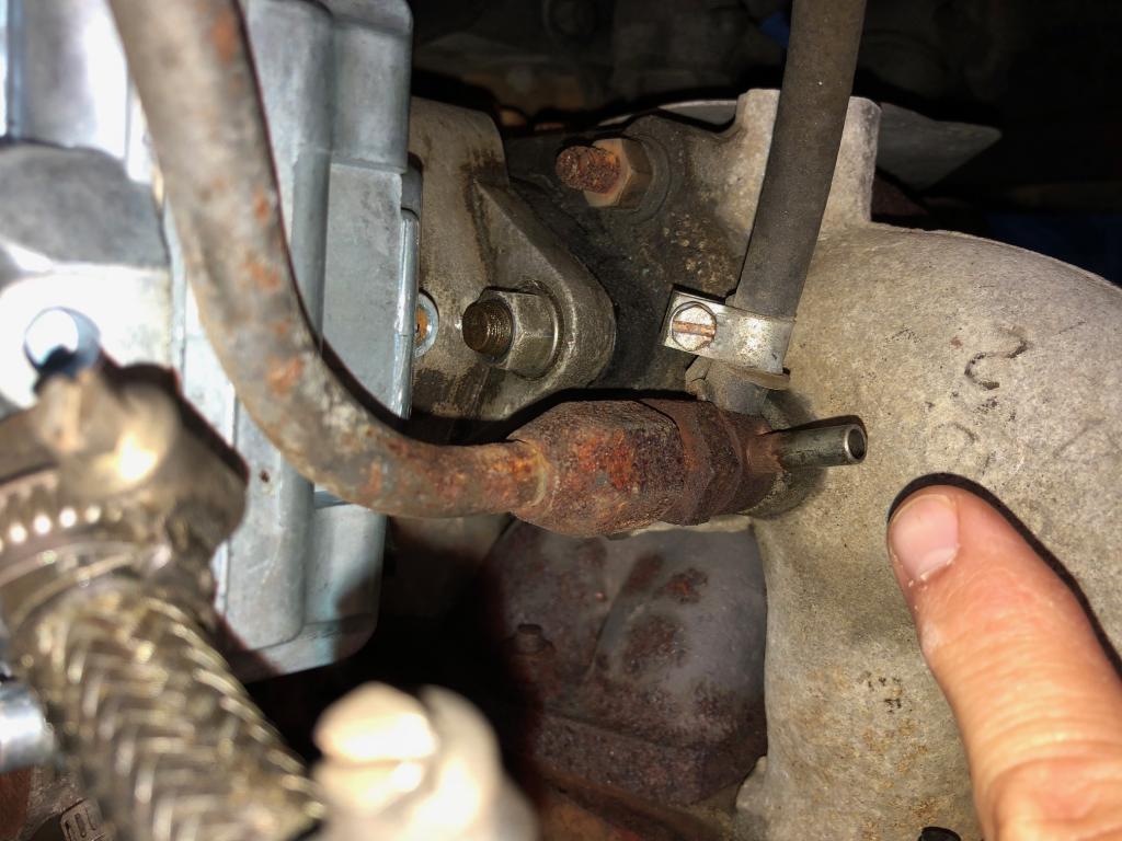 I have a '73 Series III. I replaced the carburetor last week and noticed what I think is a missing hose or cap on an air intake tube on top of the manifoldjust in front of the carburetor. Can somebody please tell me what the function of this small air intake is? I'm pointing to it in this series of photos. When I cover that intake with my finger the engine runs slightly better. It feels like it should either be capped or should have a tube attached running to another place. Any help would be greatly appreciated.
