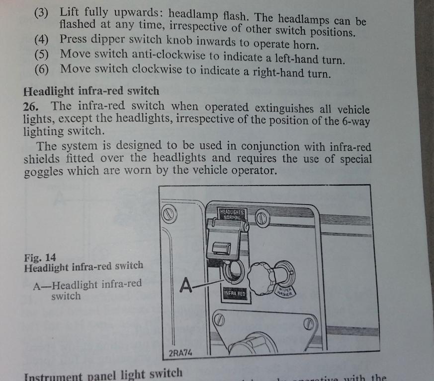 My infrared switch turns everything off. Problem somewhere it appears.On the Military 2A Lightweight I once had , the S.Conv. position put the sidelights and convey on, no head or tail lamps. See attached extract from military Handbook for S2/2A , the S3 Lightweight Handbook shows the same . The Infrared switch should extinguish all lights other than headlights.