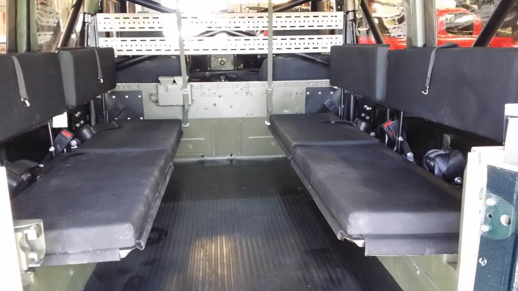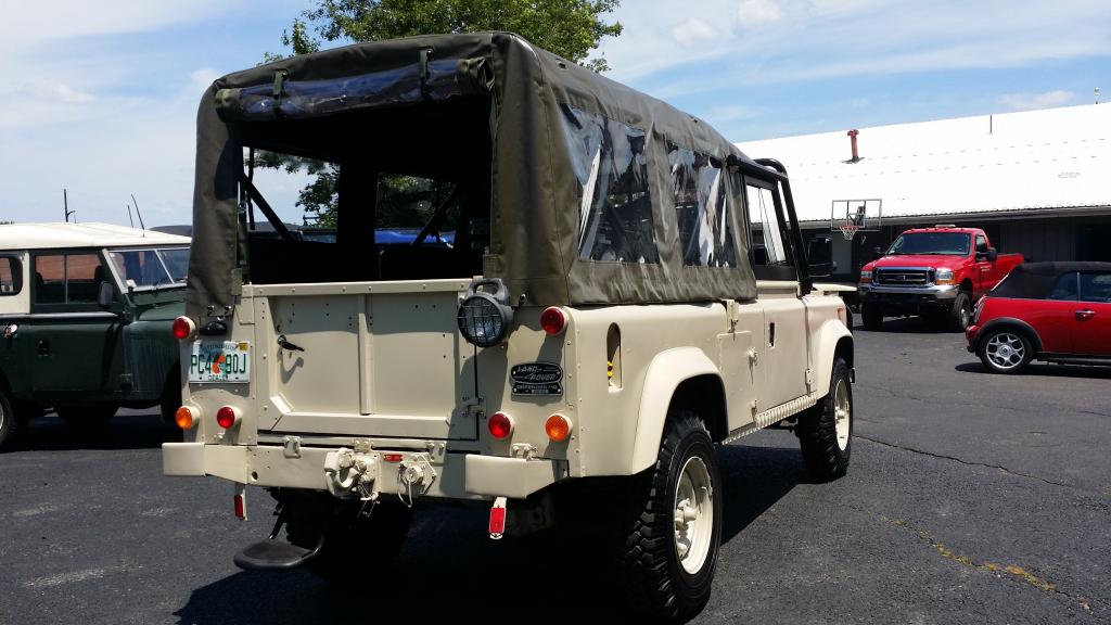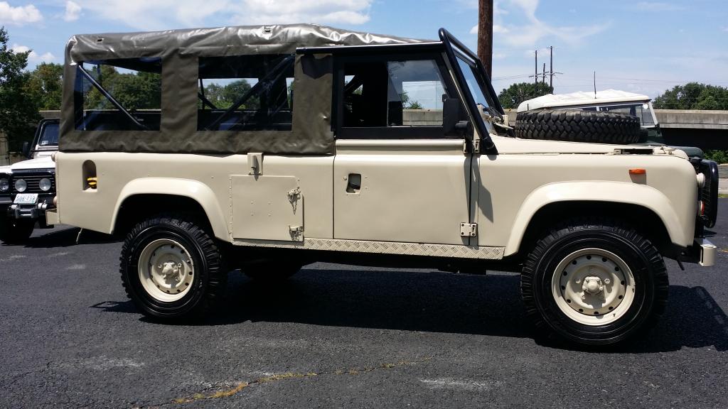 This is a splendid example of an X-MOD Defender 110. It was part of the "Tihonus Project" and thus was restored at great expense . It was a hard top FFR Unit that jut underwent a soft top conversion using new oem parts. It also just received a respray in "Nantucket Sand", power steering kit, center console ,stereo, NAS Door Panels , rear worklamp , rear step, heavy duty snatch bull bar, etc. It features nearly new Exmoor Outlast Seating . An extra set of the Wolf Rear Bench Seats were also just added. Seating capacity is ten people! The vehicle rust free and just had the chassis professionally Waxoyled by a Rovers North Certified Installer to keep it that way.
