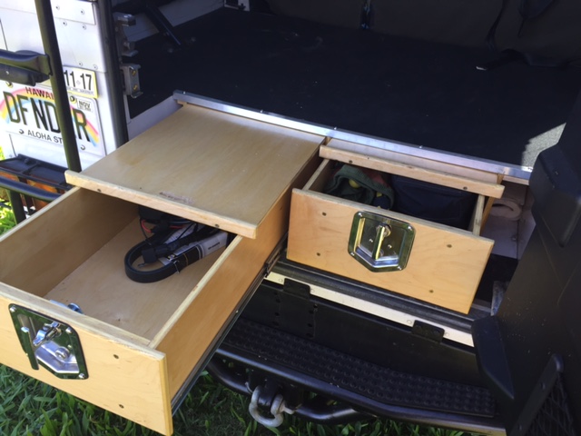 Rear drawer system with pull out shelves