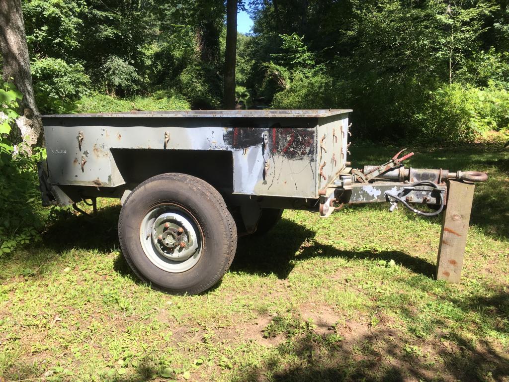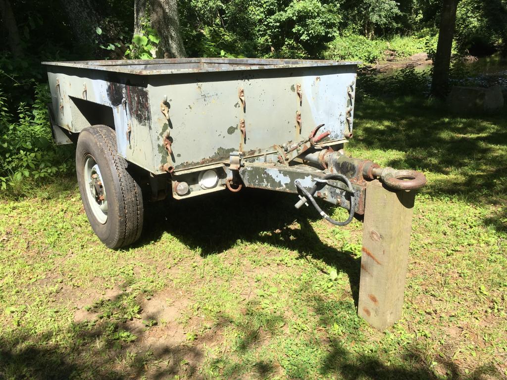 It’s in typical shape for trailers of this age, the outside is decent with many various colors of paint. There are some finger size holes in the bedsides but nothing that would prevent you from loading it up with Mulch or Manure. The Front leg was bent from P.O. driving with it down. I have the leg, but I removed it from the trailer. The tires are new(ish) and are on 16” Rims to match your Rover. The handbrake works. The chassis of the trailer is in good condition. It’s a good example of an unmolested Sankey for use or restoration.