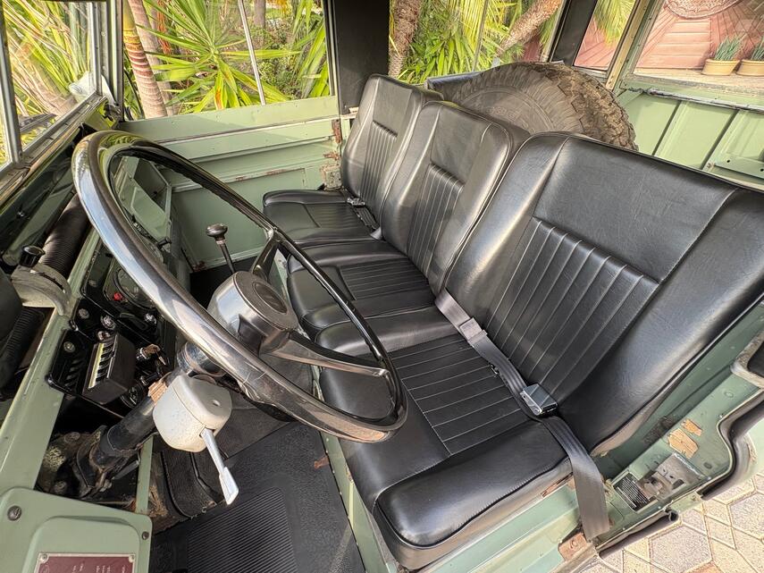 - As well on interior, it has the original driver’s floor mat (wildly rare), tranny tunnel upholstery cover, very clean OG shiny steering wheel with no sun-fried bakelite crumbling off in your hands, OG rear cargo mat, and bench seats with Land Rover paper tags still on them, and topping it off… the headliner is in good condition with some expected age marks and just one, ~inch long tear above passenger but is otherwise unbelievably fully intact, no sagging, no seam splits… it looks great for its age.